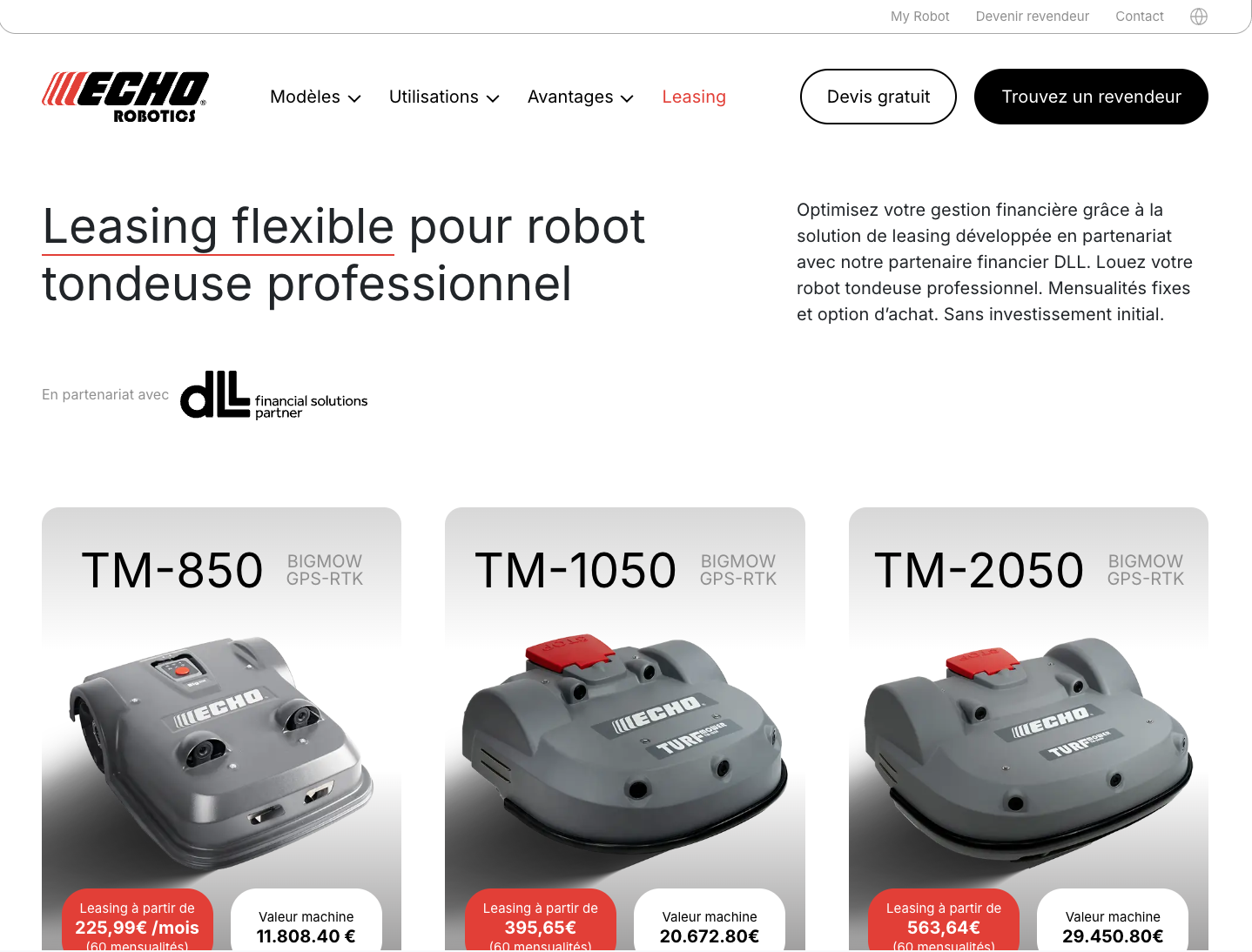 ECHO Robotics, issue de l’évolution autour de l’acquisition de Belrobotics par Yamabiko Europe, opère dans le secteur exigeant de la robotique de tonte et d’entretien automatique des espaces verts. La marque avait besoin d’un site web reflétant son positionnement, un mélange d’expertise historique, d’innovation technologique et d’ambition internationale. Le challenge technique : transposer une direction artistique forte en un site fonctionnel, scalable, performant et facile à maintenir au quotidien.